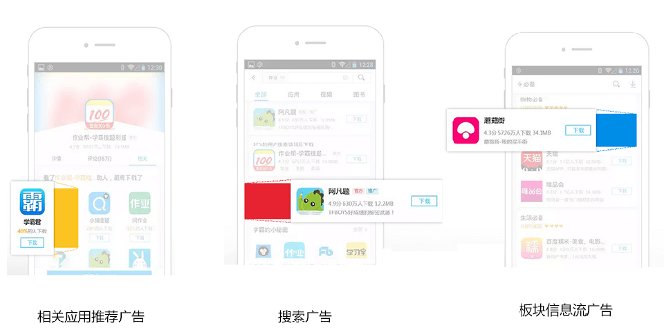 应用宝广告展示:板块信息流广告、搜索直达广告、搜索结果广告、相关应用推荐广告等。